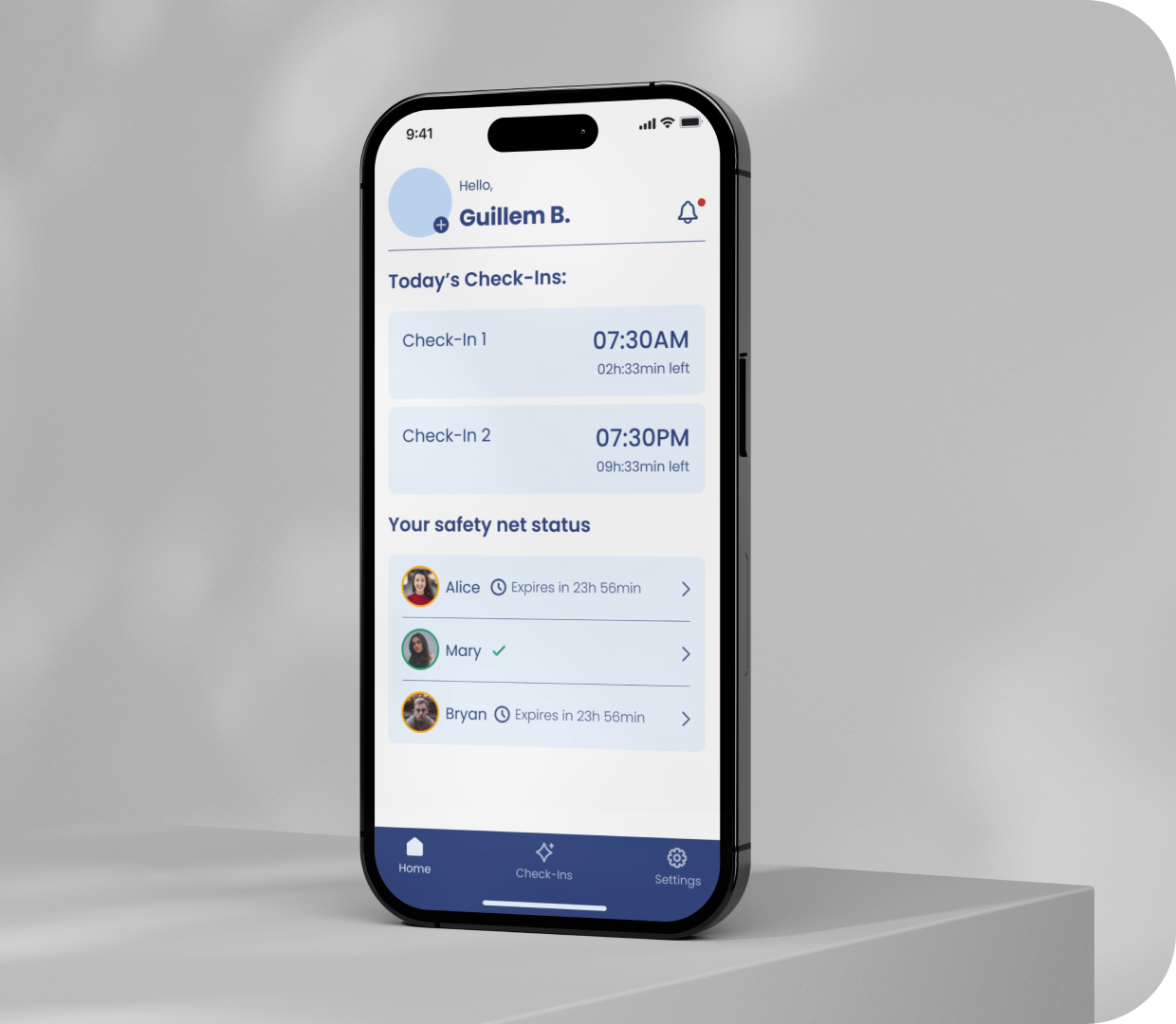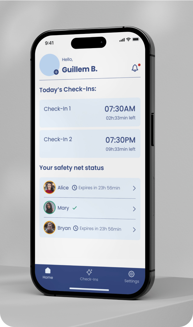 If you miss a check-in, we'll contact your safety net to take action